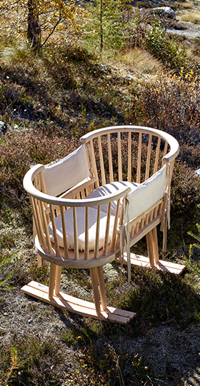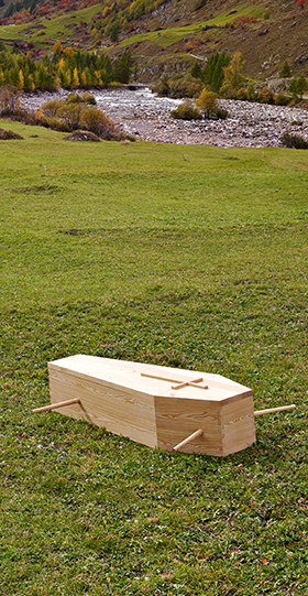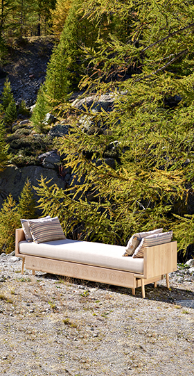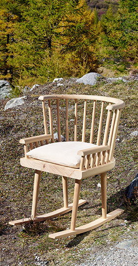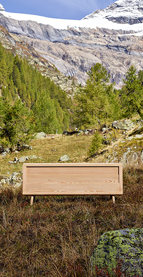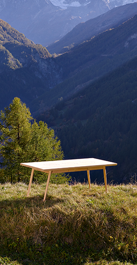 Truhe, Hocker oder «Gütschi» sind Möbel, die an lebendige Traditionen erinnern. Die Walliser Architekten aus Brig passen die Archetypen funktional an die heutige Lebensart an. Jedes Stück wird aus Walliser Lärchenholz von der Gampeler Schreinerei r-team geschreinert – in Einzelfertigung und wo möglich Holz in Holz, ohne Schrauben und Beschläge. Die Stoffbezüge werden von der Fondation Marie Métraillier im Eringertal von Hand gewoben und von der Siderser Ecole de Couture genäht.